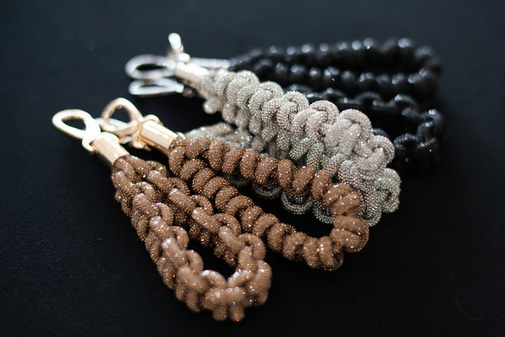 Add a touch of sparkle and style with our knotted wristlet, crafted from high-quality crystal cord. This versatile accessory is perfect for attaching to your clutch, phone, or keys, offering both practicality and a hint of glamour. Whether you're looking to keep your essentials close or elevate your everyday bag with a bit of bling, this wristlet adds a chic, eye-catching detail to any ensemble. Lightweight, durable, and effortlessly stylish, it's the perfect way to carry a little sparkle wherever you go!